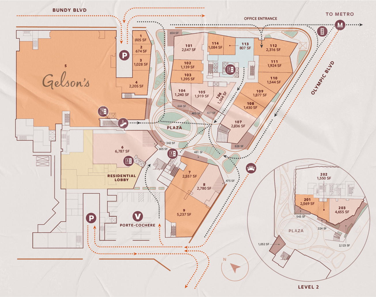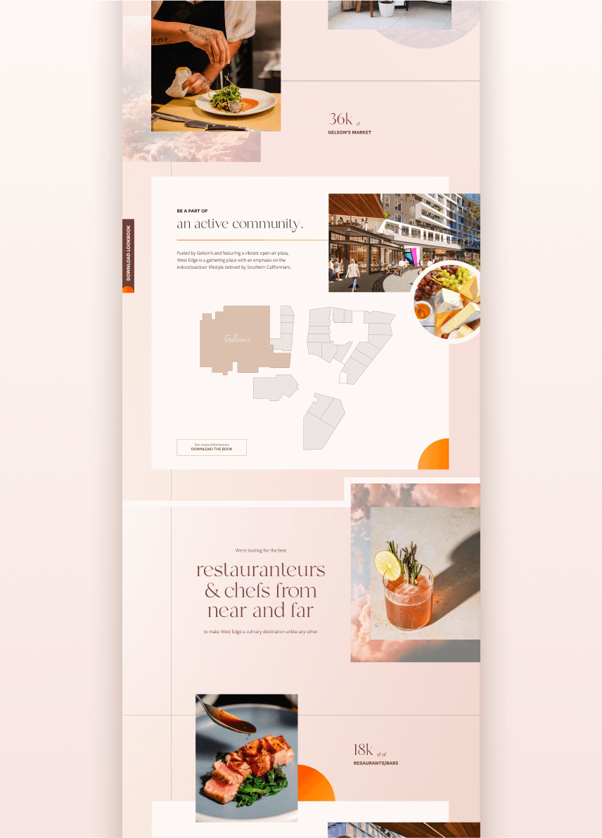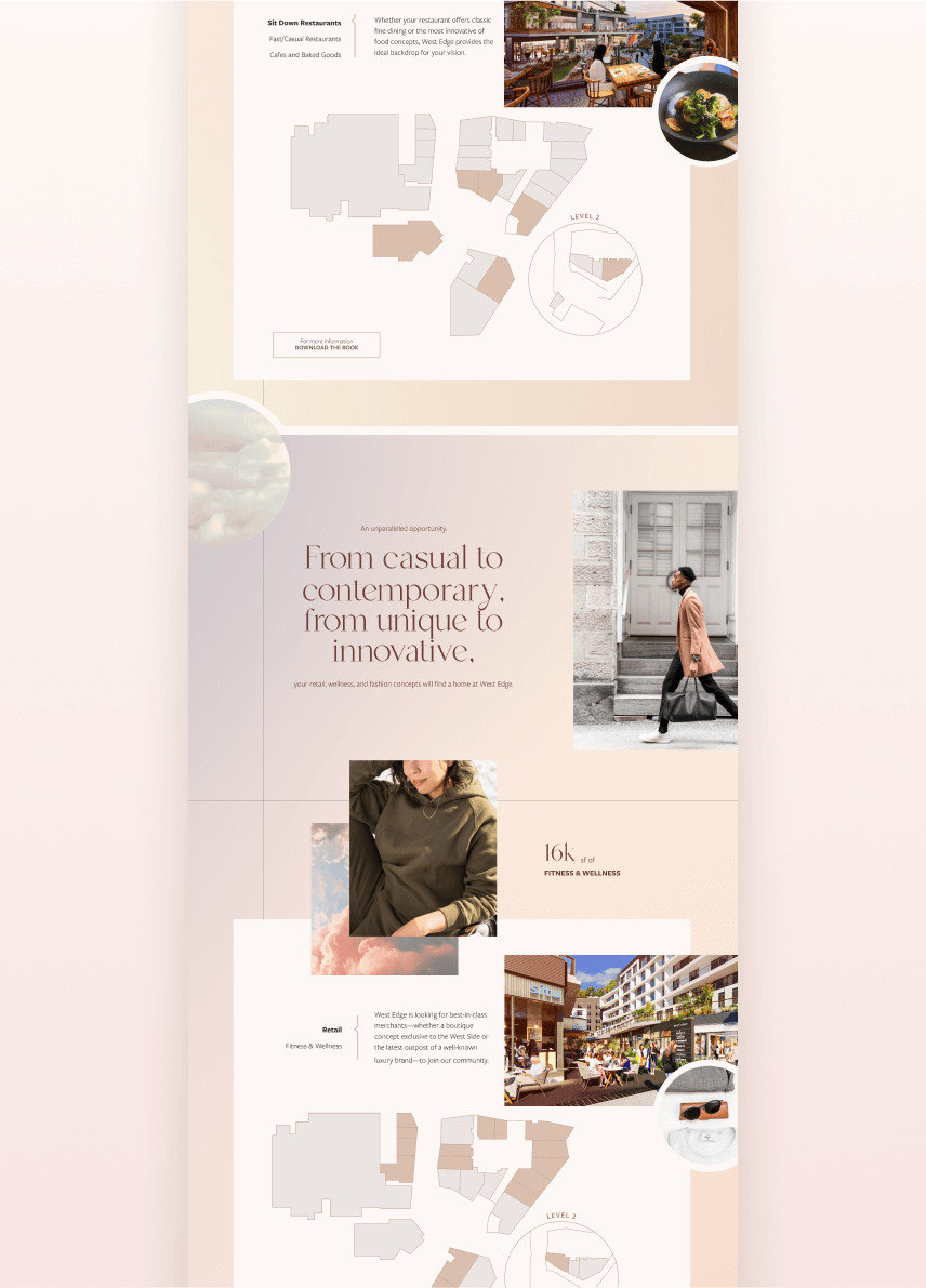 For this iteration of the brand, we highlighted the project’s retail offerings, leaning even more into the warm, LA sunset-inspired color palette, and softening the edges of the brand with dreamy clouds and gradients. To showcase the ideal merchandizing mix, we directed a series of updated renderings and paired them with aspirational mood imagery.
